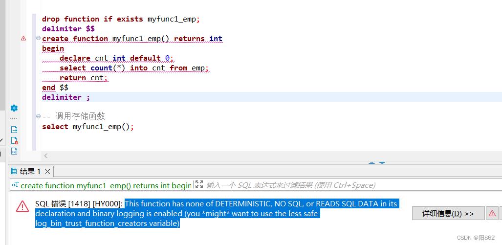 意思是说“此函数在其声明中没有确定性、无 SQL 或读取 SQL 数据,并且启用了二进制日志记录(您*可能*希望使用不太安全的 log_bin_trust_function_creators 变量)”