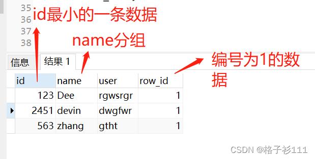 查询结果先是经过name分组,然后组内进行id升序排序,组内编号为1的第1条数据,自然就是id最小的数据。