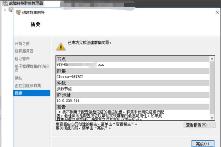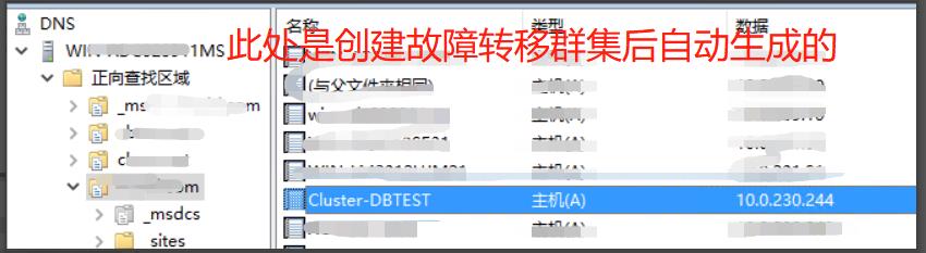 4、下面就是按你的设置进入自动配置,配置完成如图。同时域控中会自动生成一条以群集名称和IP的主机(A)记录,和计算机。