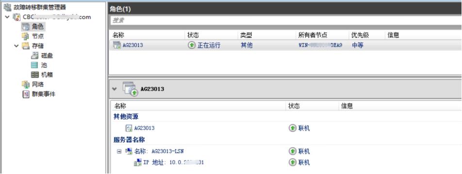 5.7.1、在故障转移群集内会自动产生一个以“可用性组名”命名的角色,角色内已包含侦听器,如下图: