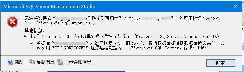 PS:使用WITH RECOVERY后,还要从新添加到可用性组时可能会出现如下错误: