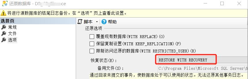 解决:如果后续还要将此数据库加入到可用性组,就使用:RESTOREDATABASEDBNAMEWITHNORECOVERY; 反之使用 WITH RECOVERY。
