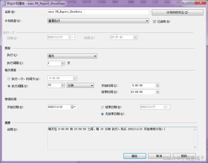 3.4)每天频率我选择的是执行间隔十分钟执行一次,开始时间和结束时间根据自己需要选择时间段