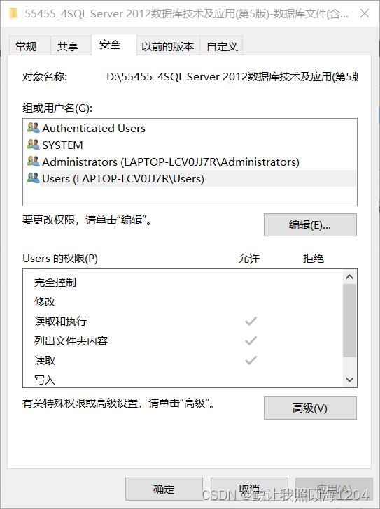 2.在选择组或用户名列表中,选择AuthenticatedUsers,在权限列表中选中完全控制。