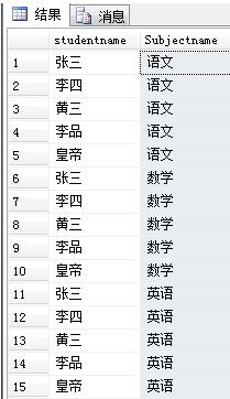 select studentname, Subjectname from Student ,Subject ;会出现下面的情形,也就是笛卡尔现象,表一有5条记录,表二有3条记录,那么对于第一张表而言有5种选择,而对于第二张表来说有3种选择。所以结果就是5*3种选择了,也就是笛卡尔积。