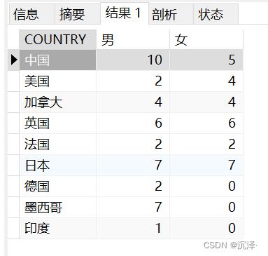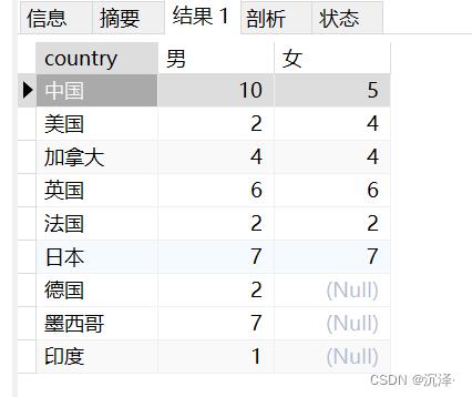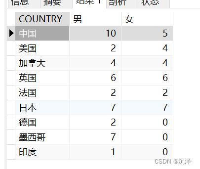 统计每个国家的男生人数和女生人数,要求结果如下: