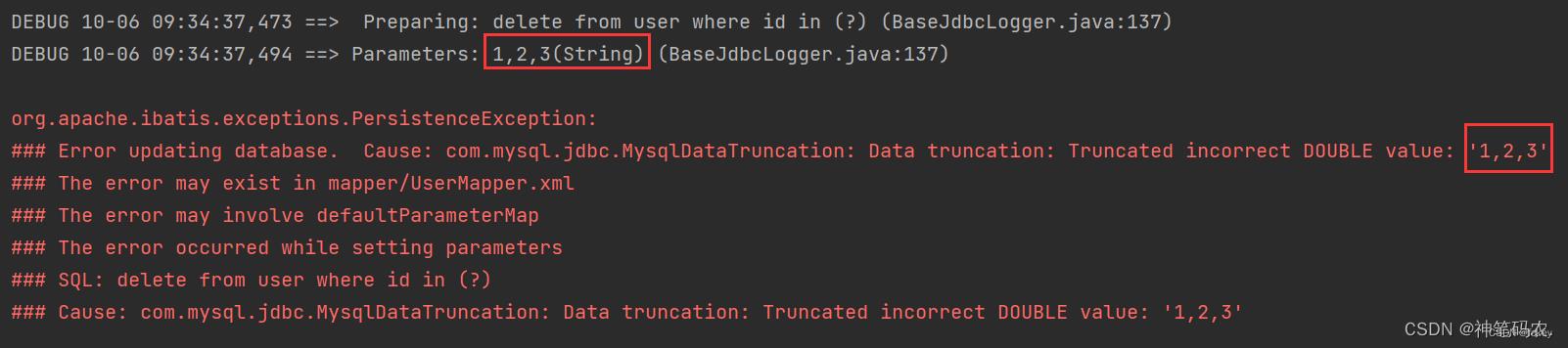 </delete>结果报错,原因在于in后面的小括号里面的'1,2,3'为字符串类型且为一个整体,与整数类型不符,因此不能使用#{}