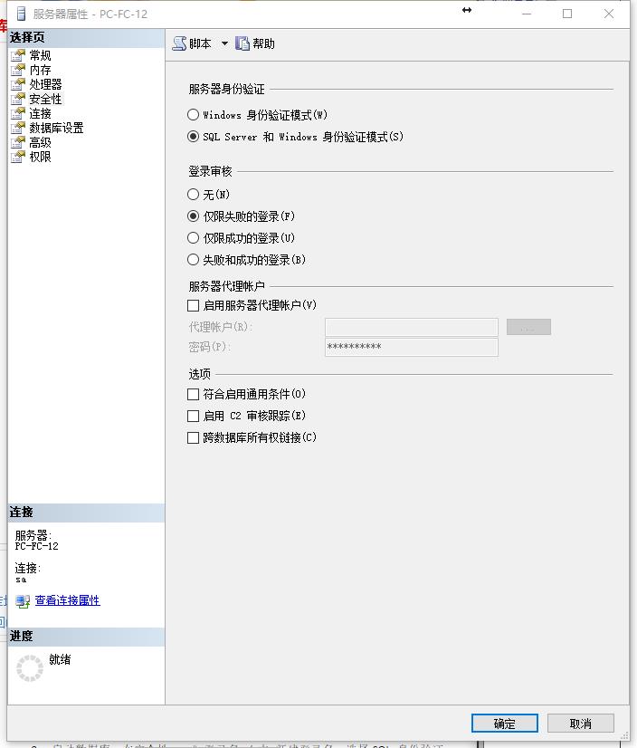 6.打开SQL server,在对象资源管理器下,右键数据库——属性——安全性,将服务器身份验证windows身份验证模式改为SQL server 和Windows身份验证模式
