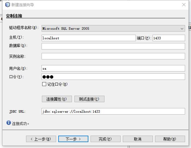 4.在主机输入localhost,端口输入1433,输入正确的用户名和密码,点击测试连接,如图就是正确的,如果报红字说驱动不可使用,请查看自己的驱动文件夹java\..\jre\lib\ext,sqljdbc是不是放多了,笔者尝试过放多个版本在里头就会报错,留下一个就OK