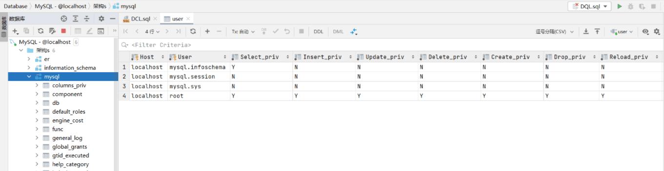 在MySQL中 用户的信息和具有的权限的信息 都是存放在系统数据库mysql中的user表中。