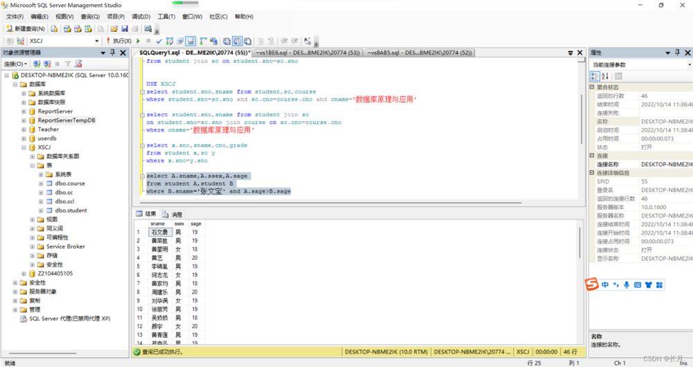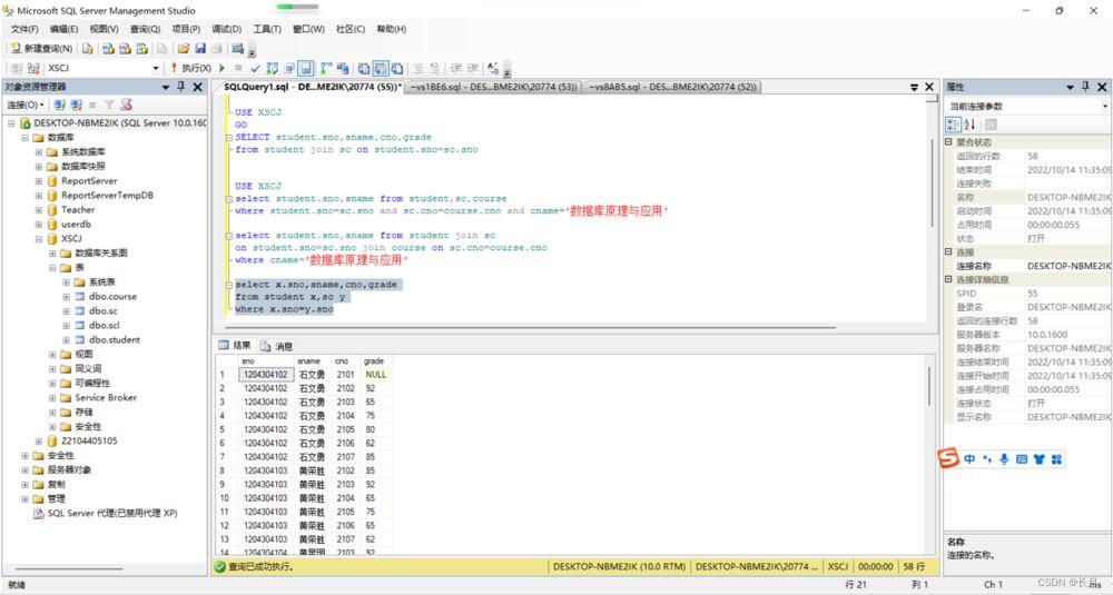 where student.sno=sc.sno and sc.cno=course.cno and cname='数据库原理与应用'