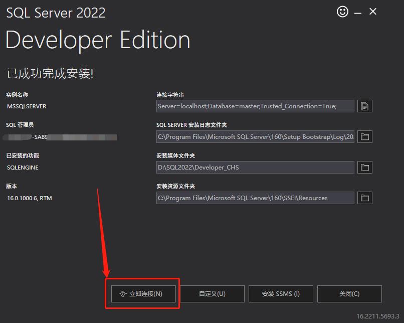 完成安装后,SQL Server会自动转入操作界面,我们在这里点击下方的立即连接按钮。