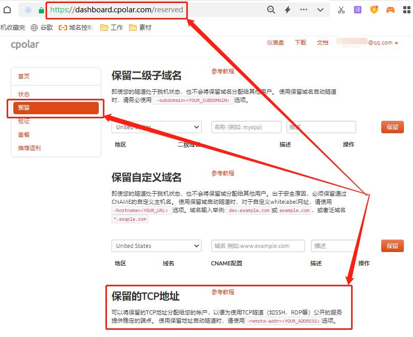 首先,我们登录cpolar客户端,在仪表台页面左侧找到预留按钮,进入数据隧道的“预留”页面。