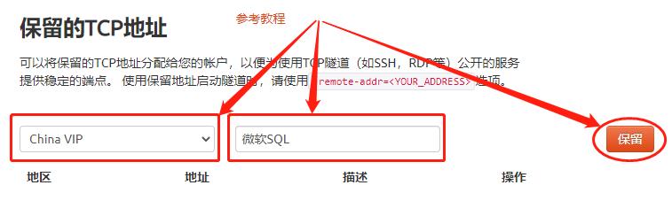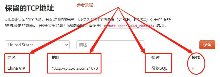 在cpolar的预留页面,我们找到保留的TCP地址栏位,为我们要连接的SQL Server设置一个公网地址,这个地址可以看做是数据隧道的入口,也可以理解为空白数据隧道(毕竟这里设置的隧道入口还没有关联本地软件的输出端口)。
