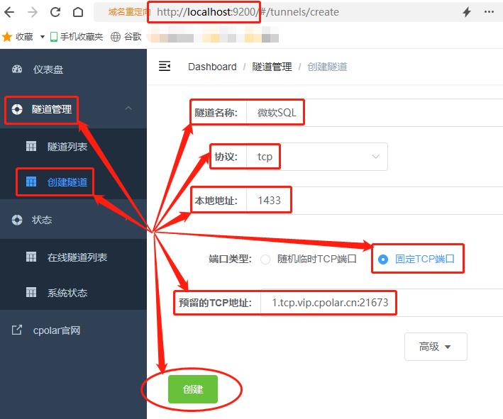在完成这些设置后,就可以点击下方的创建按钮,将cpolar云端保留的空白数据隧道与本地SQL输出端口连结起来。