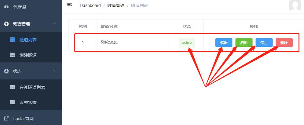 完成本地数据隧道的创建后,cpolar客户端会自动跳转至隧道管理项下的隧道列表页面。