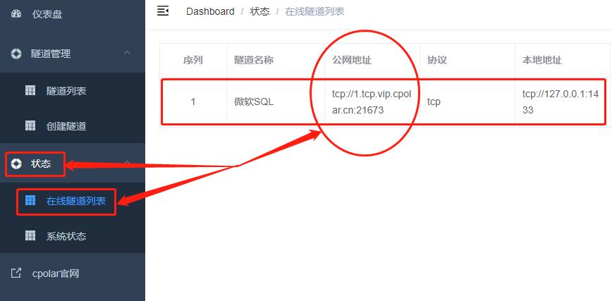 完成cpolar客户端的设置后,我们可以点击状态项下的在线隧道列表页面,找到远程访问本地SQL Server的地址(也就是隧道入口),我们将这个地址粘贴到不同的远程数据库管理软件中,就能连接到本地的SQL Server上。