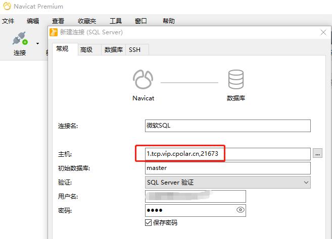 或者使用Navicat工具,在连接页面的主机栏位,填入cpolar生成的地址(去掉最前面的tcp://,并将末尾数字端口号前的冒号:改为逗号,)