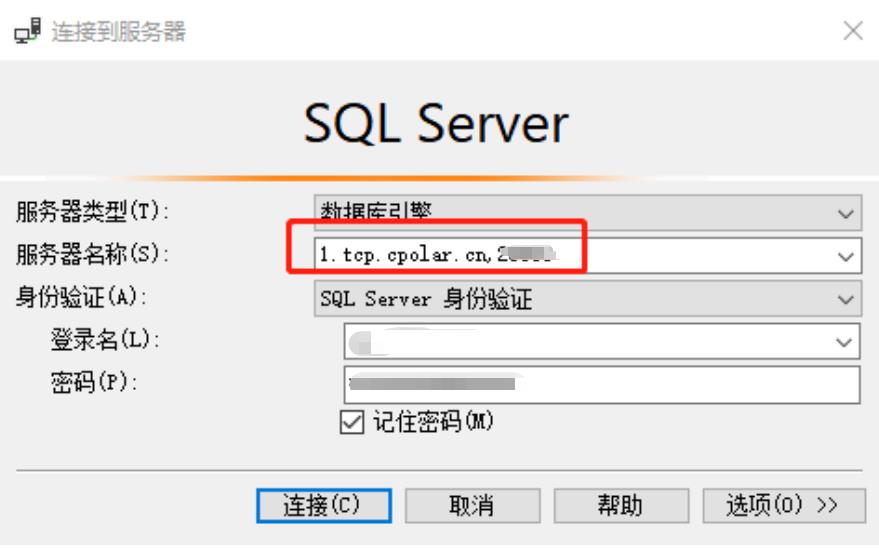 同理,我们还能使用SSMS图形界面进行远程连接,同样在连接界面,将cpolar生成的地址粘贴到服务器名称栏位(去掉最前面的tcp://,并将末尾数字端口号前的冒号“:”改为逗号“,”),就能连接到本地电脑上的SQL Server。