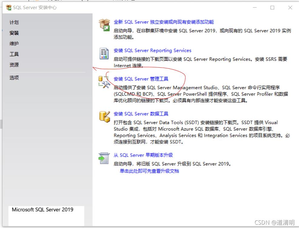 点击这个,安装SQL Server管理工具,它会跳到游览器,转到官网的链接帮你下载好,就可以获得SSMS-Setup-CHS.exe,就是安装数据库系统了(DBMS)