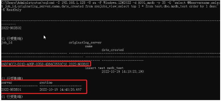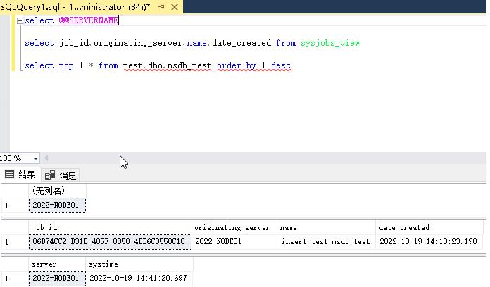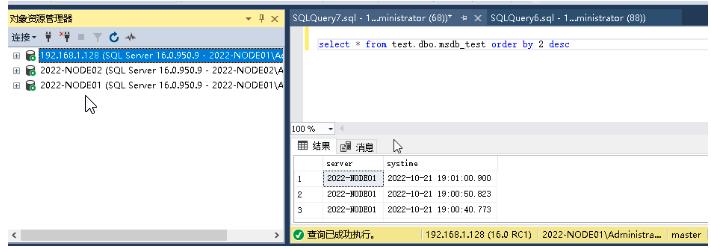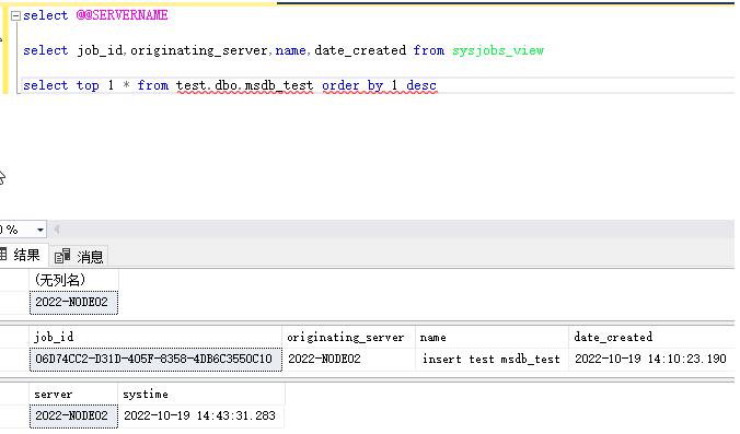 3、测试主节点故障转移到辅助节点,验证作业能否正常执行,如果能够正常执行,msdb_test表的server列会改为故障转移后的节点主机名:此处由2022-NODE01自动更改为2022-NODE02