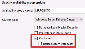 包含可用性组是在普通故障转移群集(可以是工作组、也可以是域)搭建好的基础上,创建包含可用性组时,选择"Contained"或“包含”,其它操作与之前版本的一致性组无差别。