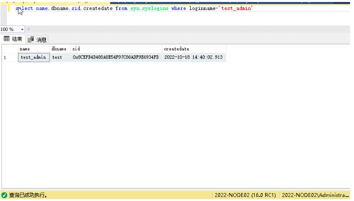 1> select name,dbname,sid,createdate from sys.syslogins where loginname='test_admin'