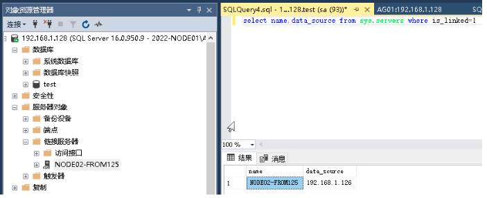 1、通过ssms工具在包含可用性组的主节点中创建了一个链接服务器