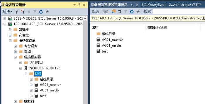 2、查询辅助节点的链接服务器情况,从视图中看到该链接服务器已经同步,并且可用