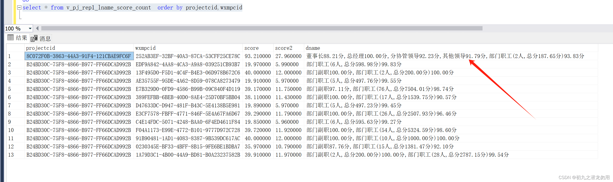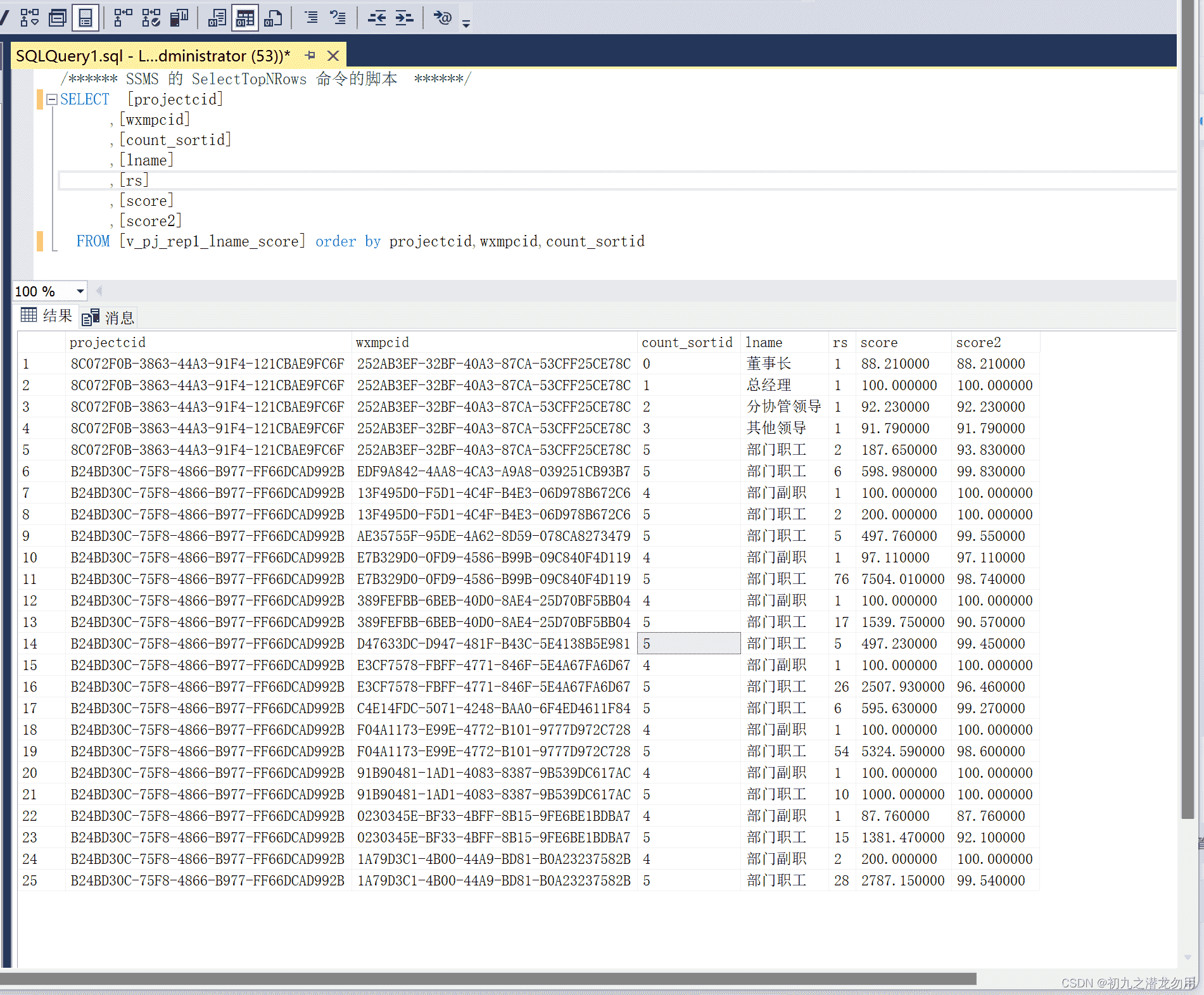 FROM [v_pj_rep1_lname_score] order by projectcid,wxmpcid,count_sortid如图咱们对于名目ID、被评估人ID、评估人职务排序号入止排序,否以望到职务越下排位越靠前。