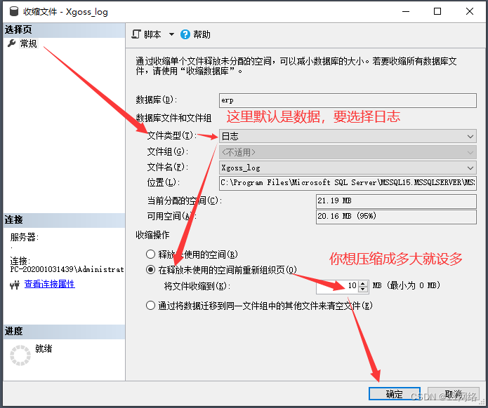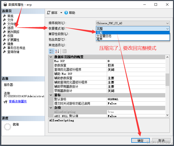 脚动紧缩日记文件。正在数据库上点击左键 → 选择 属性 → 选择 选项,把模式改成简略