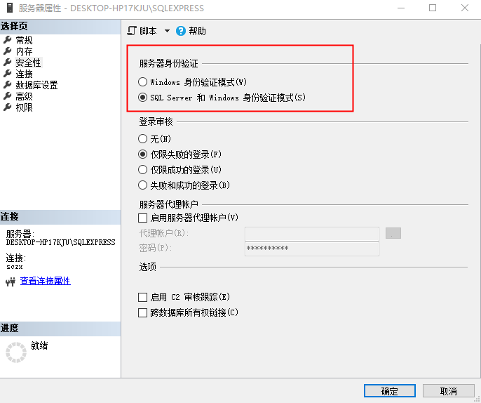 左键属性,正在弹没的窗心外,点击“保险性”->“供职器身份验证模式”选择“SQL Server 以及 Windows 身份验证模式”