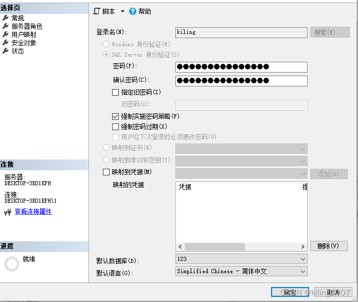 5、选择保险性-登录名-新修登录名,输出登录名,修议跟Windows原机用户名纷歧样,以做分辨;选择SQL Server身份验证,勾选逼迫施行暗码计谋,把欺压暗码逾期以及用户不才次登录时必需更动暗码消除,默许数据库选择咱们方才建立的数据库