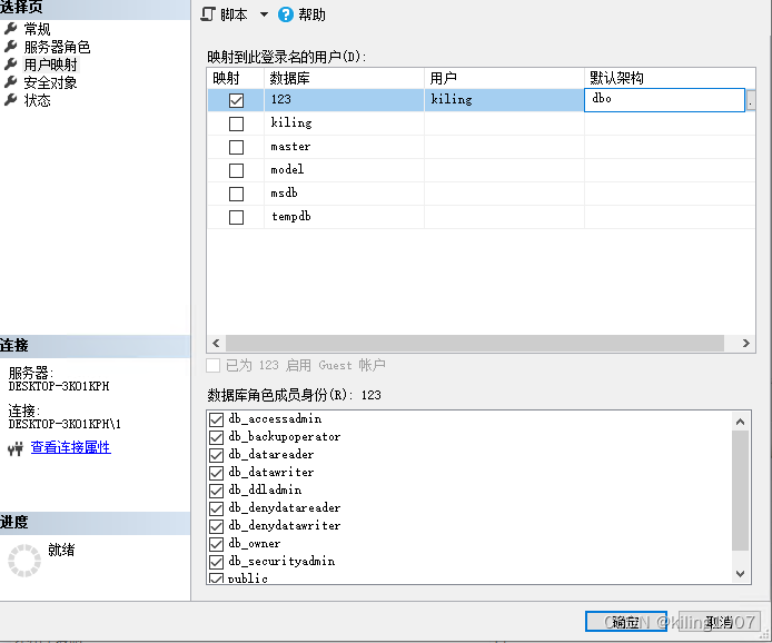 7、用户映照,确认数据库可否未映照,默许架构是dbo,为了后续进修不便,否以把数据库脚色成员身份齐选上【实施情况否以那么垄断】