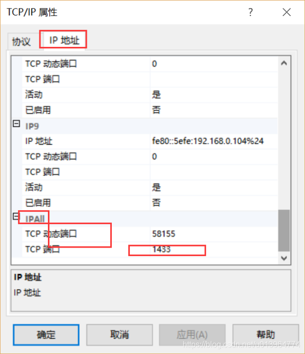 点击ip所在选项卡,推毕竟部,将ipAll的TCP端心改为1433
