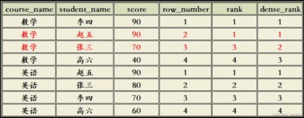 SELECT student_name, score, DENSE_RANK() OVER(ORDER BY score DESC) AS 'rank' FROM grade;按照分数对于异科方针教熟从下到低排名,造诣雷同,排名没有类似