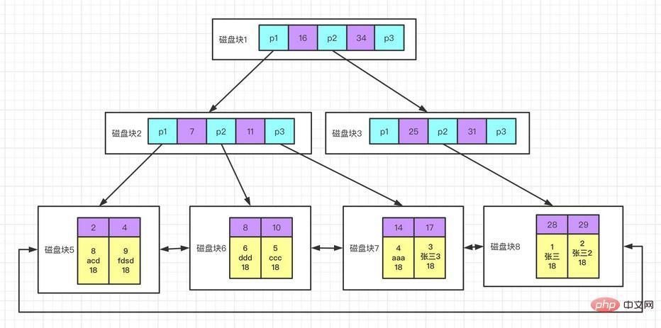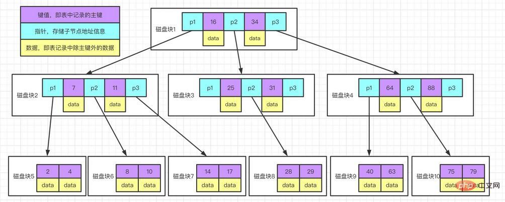 每个节点占用一个磁盘块,一个节点上有两个升序排序的关键字和三个指向子树根节点的指针,指针存储的是子节点所在磁盘块的地址。两个关键词划分成的三个范围域对应三个指针指向的子树的数据的范围域。以根节点为例,关键字为 16 和 34,P1 指针指向的子树的数据范围为小于 16,P2 指针指向的子树的数据范围为 16~34,P3 指针指向的子树的数据范围为大于 34。查找关键字过程: