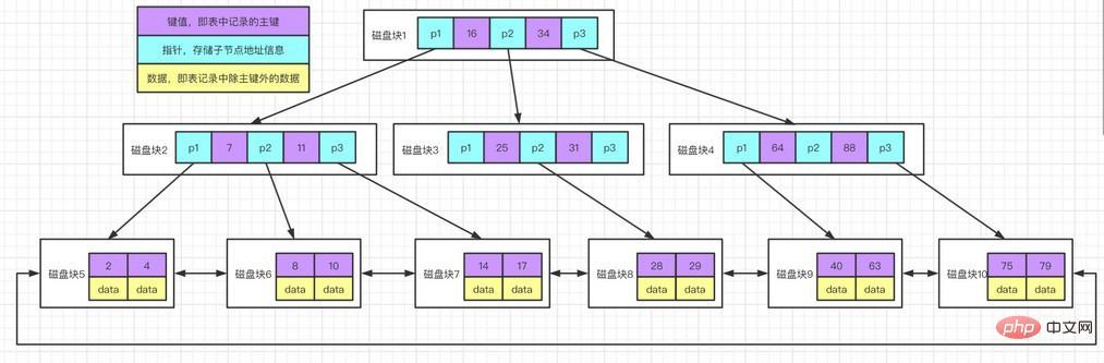 在B+树上有两个指针,一个指向根叶子节点,另一个指向关键字最小的叶子节点,而且所有叶子节点(即数据节点)之间是一种链式环结构,因此可以对B+树进行两种查找运算:一种是对于组件的范围查找,另一种是从根节点开始,进行随机查找。