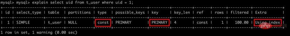 --将uid设置成主键索引后通过下面的SQL查询 在explain的Extra列可以看到“Using index” explain select uid from t_user where uid = 1;