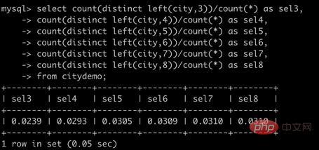 可以看到当前缀长度到达7之后,再增加前缀长度,选择性提升的幅度已经很小了。由此最佳创建前缀索引长度为7。