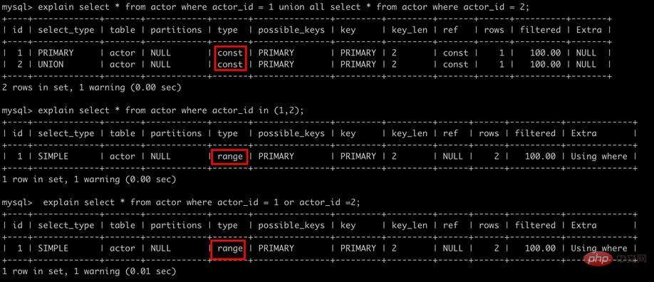 explain select * from actor where actor_id = 1 union all select * from actor where actor_id = 2; explain select * from actor where actor_id in (1,2); explain select * from actor where actor_id = 1 or actor_id =2;