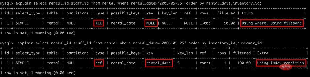 --该查询为索引的第一列提供了常量条件,而使用第二列进行排序,将两个列组合在一起,就形成了索引的最左前缀 explain select rental_id,staff_id from rental where rental_date='2005-05-25' order by inventory_id desc --下面的查询不会利用索引 explain select rental_id,staff_id from rental where rental_date>'2005-05-25' order by rental_date,inventory_id