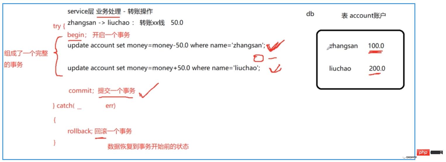 begin:开启一个事务要执行的全部sql语句都成功了,然后commit提交一个事务如果其中任何一条SQL语句由于停电、或者服务器出错,导致SQL执行异常,那事务就没有提交,事务会回滚(rollback),数据将恢复到事务开始前的状态