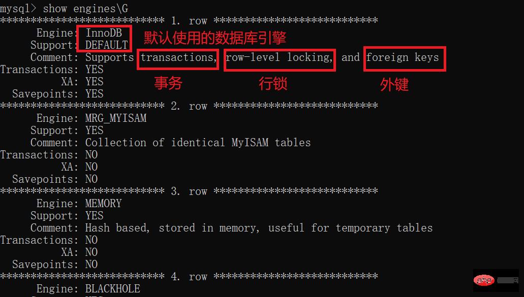 用show engines\G查看当前数据库支持哪些存储引擎。
