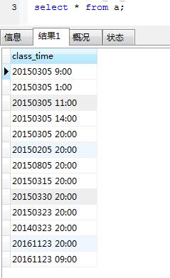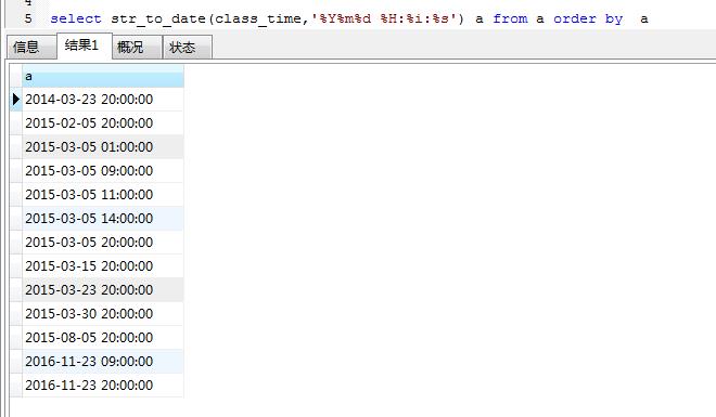 语法:select str_to_date(class_time,'%Y%m%d %H:%i:%s') a from a order by a desc ;