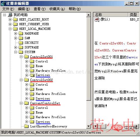 MySQL注册表中的ControlSet001,ControlSet002,不一定是001和002,可能是ControlSet005、006之类,删除的时候,都删除就可以;
