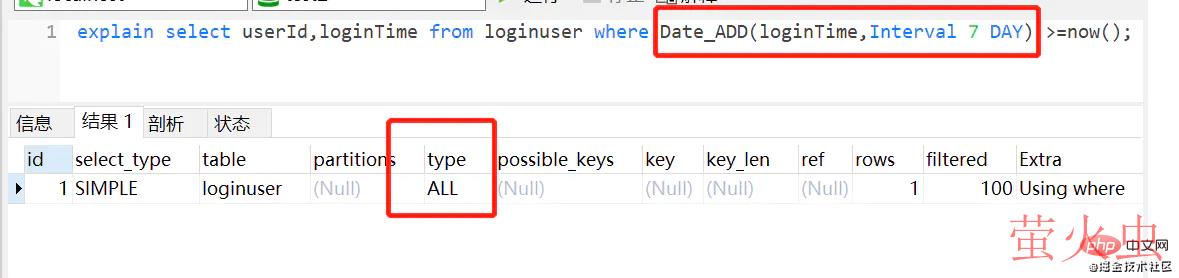 explain select userId,loginTime from loginuser where loginTime >= Date_ADD(NOW(),INTERVAL - 7 DAY);复制代码理由: