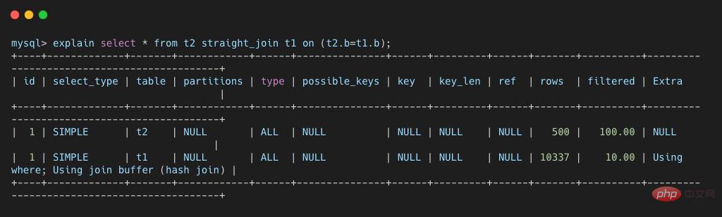 select * from t2 straight_join t1 on (t2.b=t1.b);复制代码这条语句的 explain 结果如下所示。可以看出