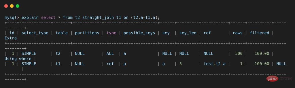 select * from t2 straight_join t1 on (t2.a=t1.a);复制代码使用我们之前文章介绍的 explain 命令查看一下该语句的执行计划。