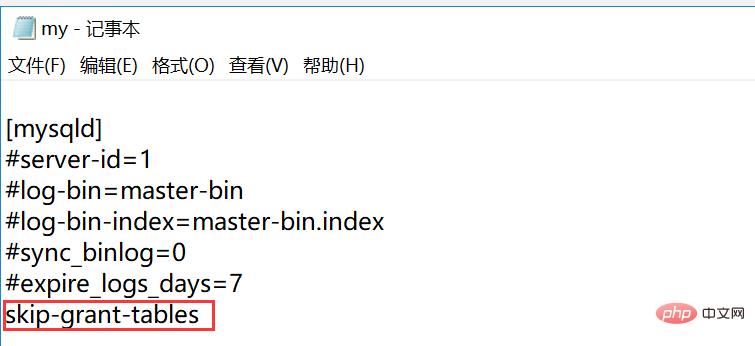 3. 在mysql安装目录下找到my.ini,记事本方式打开此文件,在[mysqld]下添加skip-grant-tables,目的是跳过数据库权限认证;